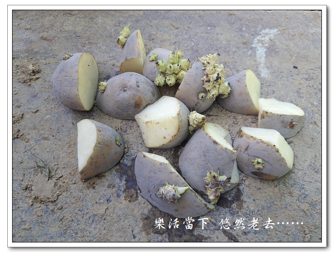將二顆馬鈴薯切成十二塊,每一塊上都保有已經發芽的新芽。