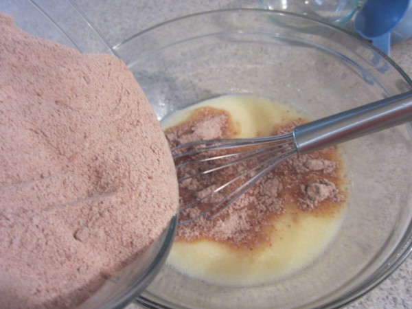 4. 將作法2.慢慢倒入作3. 加入3/4杯熱水, 再平均倒入2個烤盤