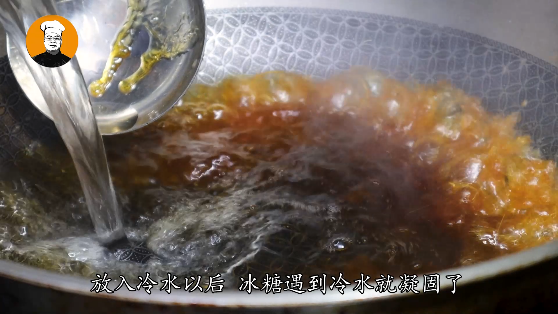 5、鍋中放入冰糖,再放入熱水,開大火把冰糖熬化,熬成焦糖色,用糖色做的茶葉蛋做好帶點微甜,吃起來有焦糖味,而且光澤度特別的亮。炒成醬油色時,轉小火倒入開水,一定要放入開水,放入冷水冰糖會凝固