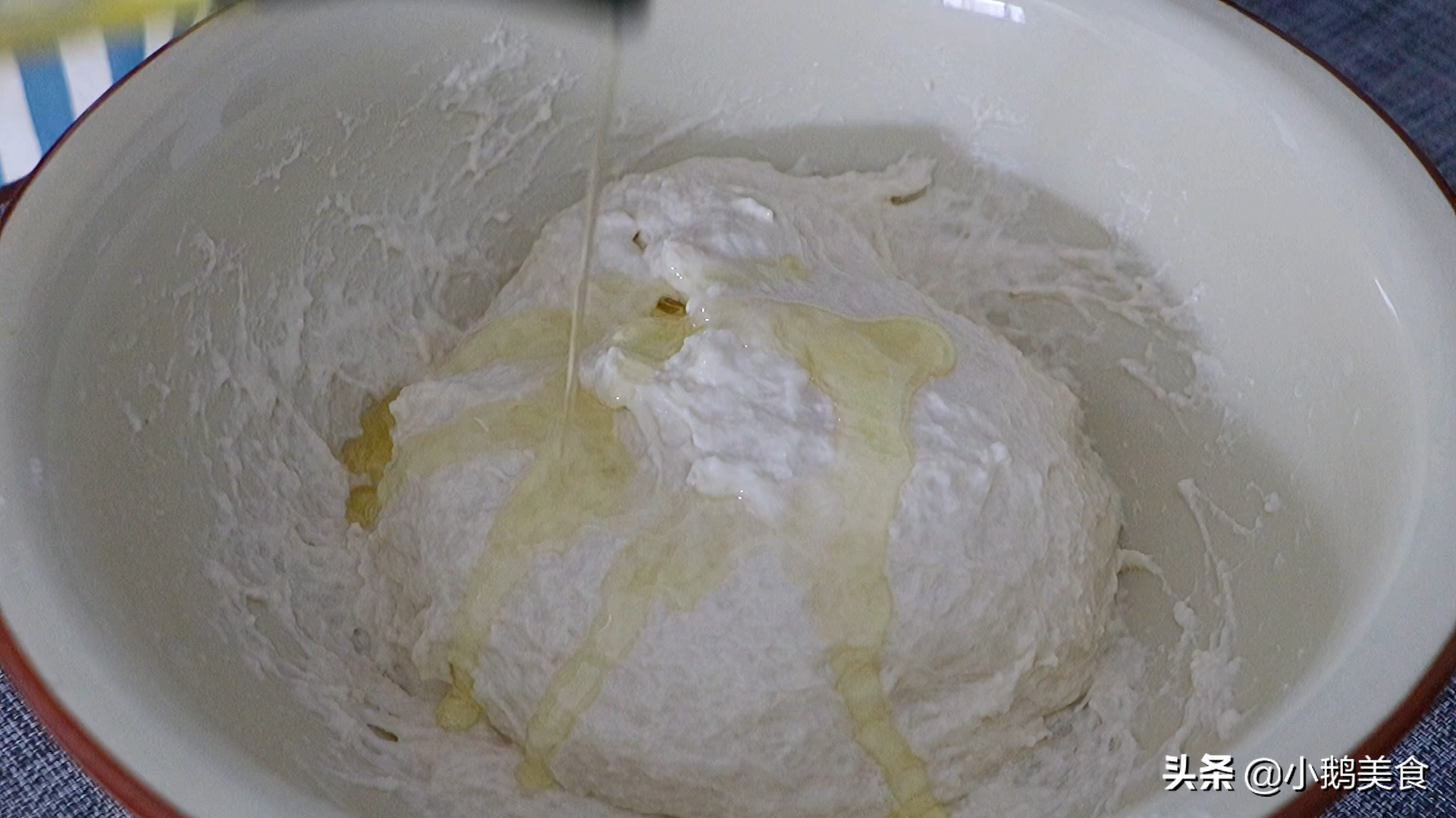 4、案板上抹一層食用油防粘。把麵團放案板上,不用揉防止麵團起筋,直接整理成長條,切成小劑子。不想抹油的,也可以撒一層乾麵粉,把麵團均勻的裹一層乾麵粉防粘,整理成長條切成劑子。撒乾麵粉和抹油的原理是一樣的,比抹油更適合新手操作。