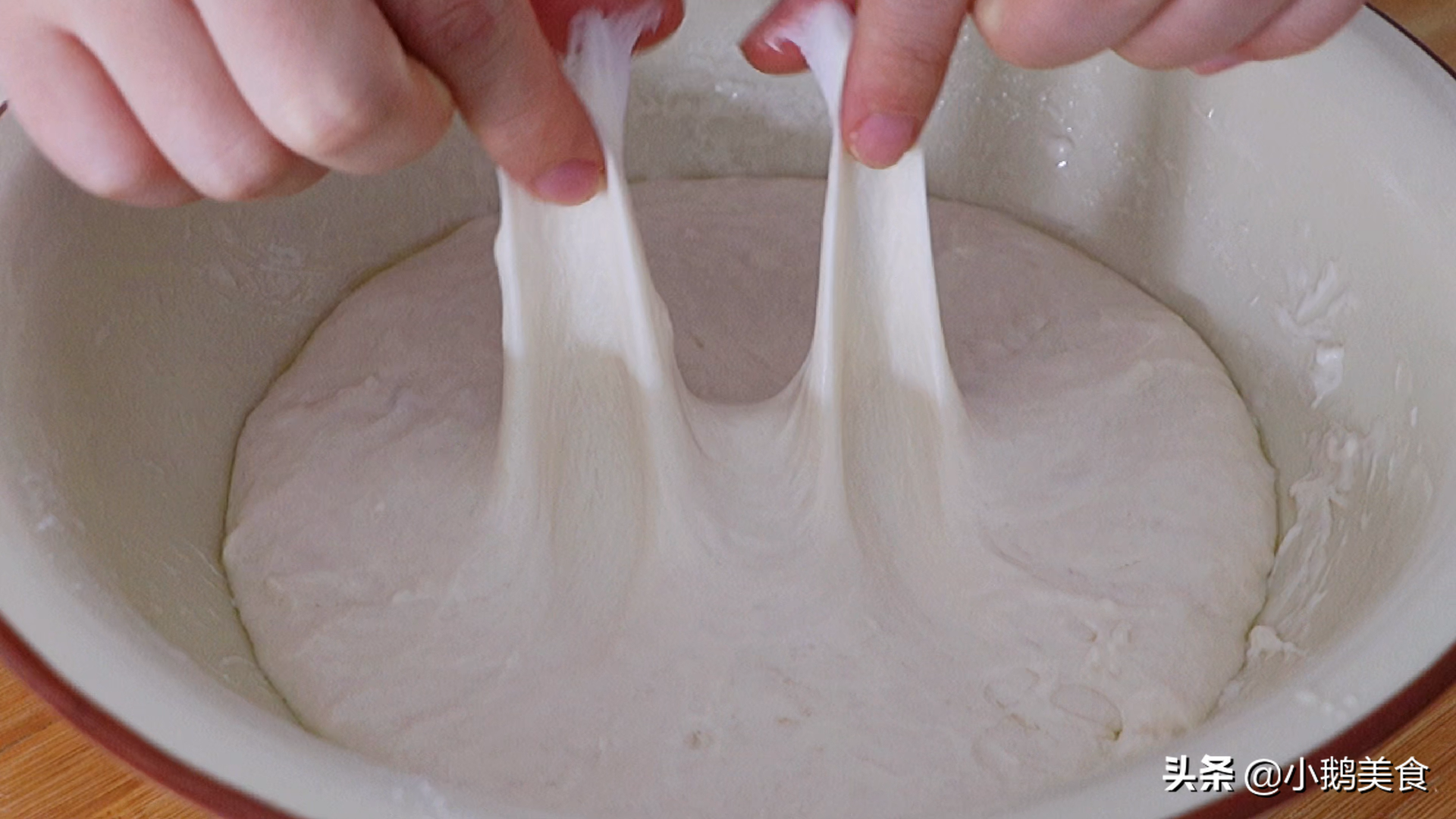 3、餳好的面特別有彈性,可以扯起好長,也不容易破,餳到位,做的餅也會更柔軟。