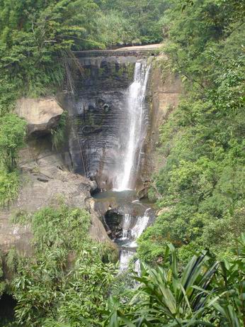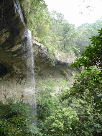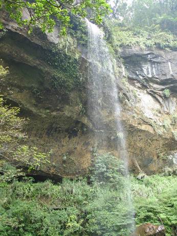 看見那絹絲般透徹的流水,自崖岩凹陷的上方垂涎渲瀉而下,猶如幽雅娟秀般的珠簾水幕,在瀑布下方的水流清涼見底,禁不住更想把毛巾沾濕來拭汗,拂拭一路攀行的疲憊!