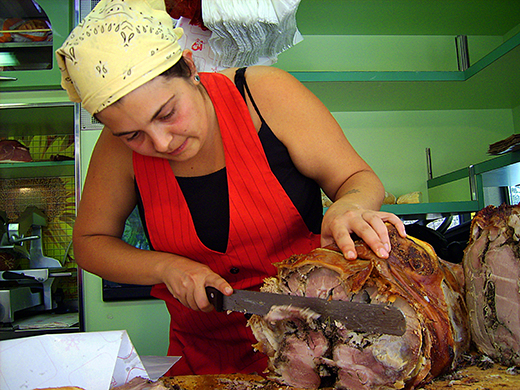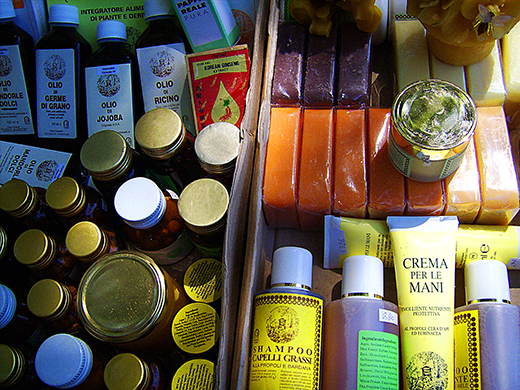Sienna這個市集我們最喜歡的就是熟食攤位,特別是烤全豬,整隻香噴噴的烤豬成一個圓筒狀、用線捆著,沒看到豬頭還一下猜不出來是啥玩意兒,秤重的方式賣,挑個喜歡的部位,老闆俐落地像片北京烤鴨似的把肉片下來,由於烤的熟透,有些肉其實是順勢崩落的,口味挺重,配生啤酒可是人間一大美味啊!對了,土特產或是自家私房產品也值得一逛,有個老人家自製的手工皂等等,我們就血拼了一大堆!托斯卡尼市集,完全符合【暴食暴走】的精髓!
