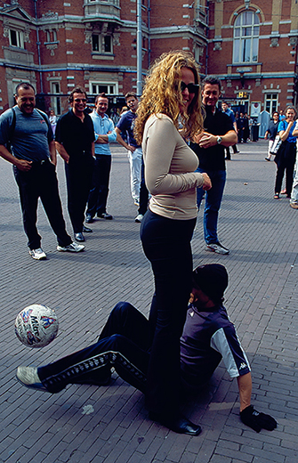 最後,壓軸好戲上場,他請來一位辣妹,上演一齣荷蘭版的【坐懷不亂】,他老神在在地頭頂著球從美眉跨下穿過,或者,躺在地上一手撐地托腮和她打情罵俏,同時,腳下也一點不含糊,足球就在兩腳背上來回彈跳,硬是掉不下來!