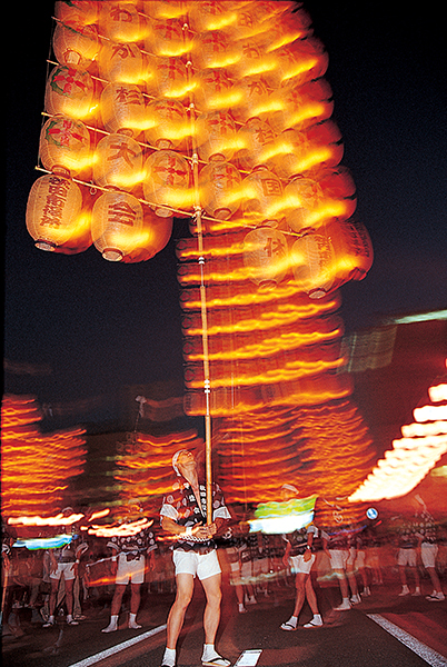 東北的夏日祭典,人氣鼎盛,連許多日本人都訂不到旅館,還沒天黑,參加的隊伍先平抬著竿燈繞街遊行暖場,這時候,路兩邊的好位置就已經幾乎被佔滿了,天色漸暗,氣氛也隨之熱絡起來,在節奏激昂的鼓聲、音調清亮的行板笛音伴奏之下,撐竿人將竿燈撐起,這一組重逾50公斤以上的竿燈,就像黏在他們身上似的,掌心、額頭、腰際……不論細細的竿子放在那個部位,都能達到完美的平衡,甚至小朋友也能一樣輕鬆的撐起較小的竿燈!整條街望過去,夜色中一串串的竿燈隨著觀眾興奮、震耳欲聾的吆喝吶喊聲,搖曳著、平衡著!不同的隊伍相互較勁,比看誰撐的久,就算是換手,竿燈也還是不會掉下來,我為了搶拍精彩鏡頭,還乾脆平躺到地上,後幕閃燈讓凍結的動作更自然、且要小心避免曝光過度,而底片是完全無法預視的!