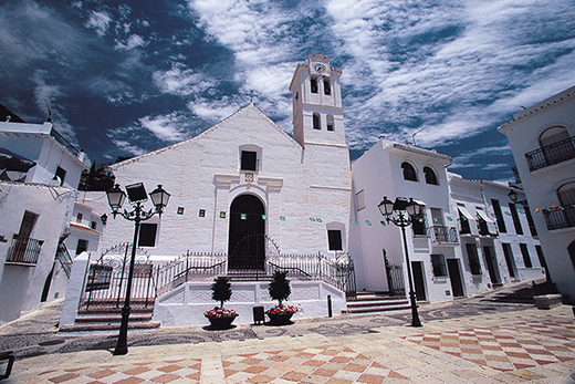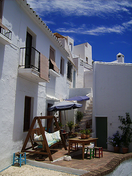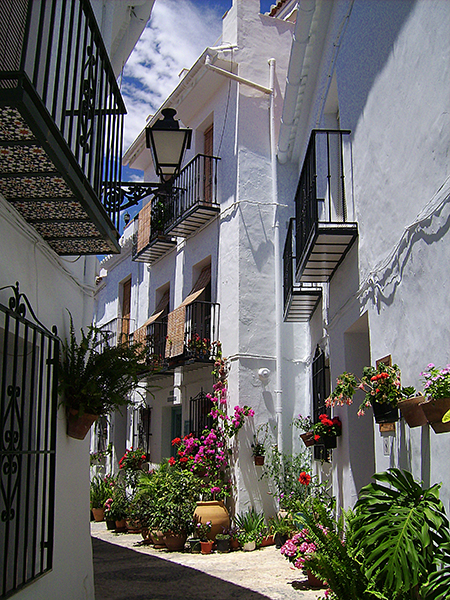小鎮中窄窄的小巷連結成迷宮樣的小路網絡,每一處皆有不同的風貌與景觀,不管是在鎮中看山看海,從海邊望過來也美的讓人屏息,許多房子景觀好、有俯瞰海景的視野,有錢人家或是民宿多配備有游泳池,這真是一處可以完全放鬆的休憩好去處,除了愛琴海氛圍之外,大部分的巷道皆是古早味濃厚的老街,是保存回教風味最完整的白色城鎮之一,摩爾人統治下的安達魯西亞,城鎮的感覺就是這樣的樣貌,山城少有寬廣的開闊地,鎮中廣場面積不算小,純白色的教堂San Antonio有著明信片中才見得到的夢幻情境,雖簡單但卻有簡潔之美,立柱像淺浮雕,周圍圍著一圈白房子,在安達魯西亞充沛的陽光照射之下更形耀眼,我在山城中走累了便在廣場小歇,靜靜地品味山城中居民生活細節的美學,在白色基調上,陽台彩色植哉、陶製花器、陶罐、竹簍當作植物的家、瓷磚拼貼而成的門牌、有新藝術風、曲線鐵件構成的招牌……,或者是靈感湧現時神來一筆彩繪的鮮艷色塊,由於巷道彎彎曲曲,峰迴路轉之餘牆上會出現彩色瓷磚以圖案敘述著小鎮的故事;不禁想,這不正是忙碌的現代人嚮往「慢活」的精隨嗎?看山看海曬太陽、用心佈置自己的生活空間,過客如我,也會真心渴望地想要短暫地當個Frigiliana人。