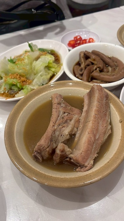 肉骨茶 排骨肉軟爛入味,湯頭非常濃郁 喝起來辣辣的,明顯的胡椒辣度和蒜頭的香氣,