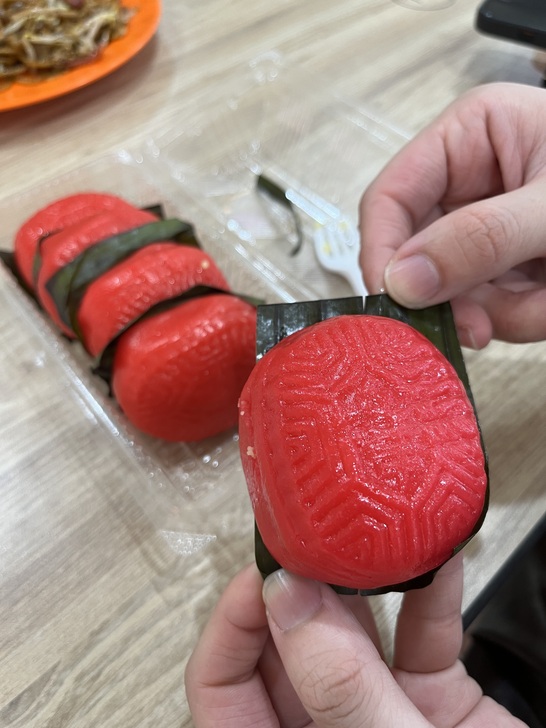Emily在中峇魯市場買了類似台灣的紅龜粿 外皮軟Q 綠豆內餡 甜而不膩的在地傳統美食