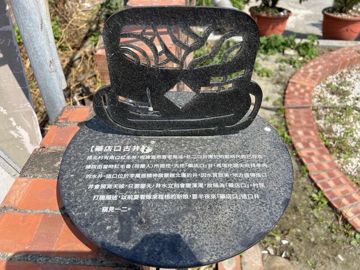 藥店口古井 據傳於明鄭時期即存在,由荷蘭人所開挖,井的水質甜美,地方盛傳此井能預測天候,逢臨變天之際,水質會變渾濁,故稱「藥店口」。(網路資訊)