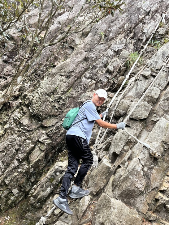 走到這裡開始了鳶嘴山岩壁攀爬考驗,攀岩的訣竅就是三點不動一點動,站穩拉好了才開始行動 確保安全。