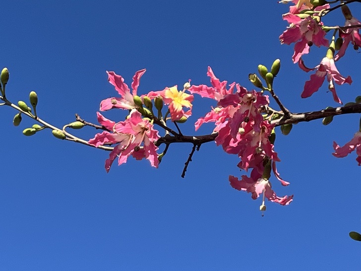 波斯菊不給力 路邊的美人樹正花開燦爛 嬌豔的粉紅色花朵襯著藍天 美極了!