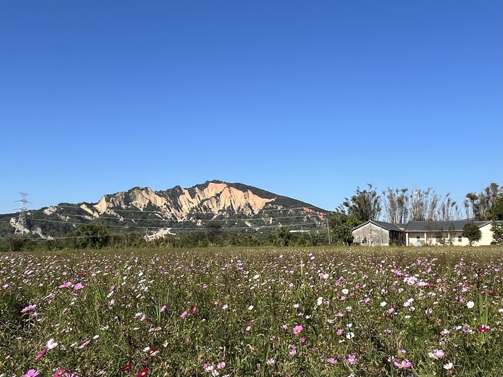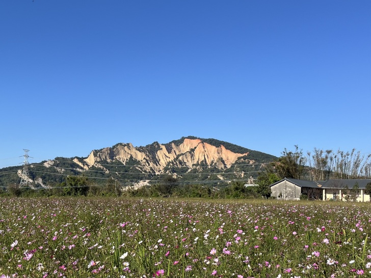 后里波斯菊花田 最大亮點就是可以將有台版大峽谷之稱的火炎山壯麗山景一同入鏡