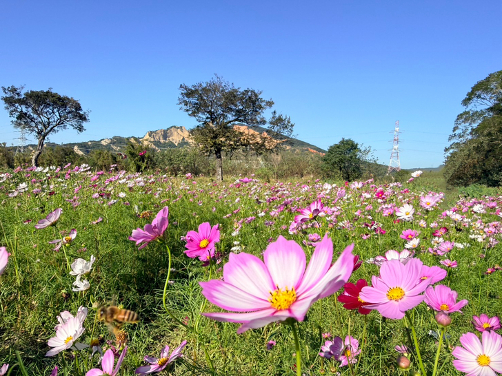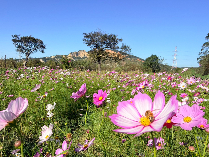 前往銅鑼之前我們先到后里很夯的波斯菊花田秘境,說是秘境一點兒也沒錯,鄉間小路我們跟著到導航繞了好多圈,停好車走了將近10分鐘才到達。