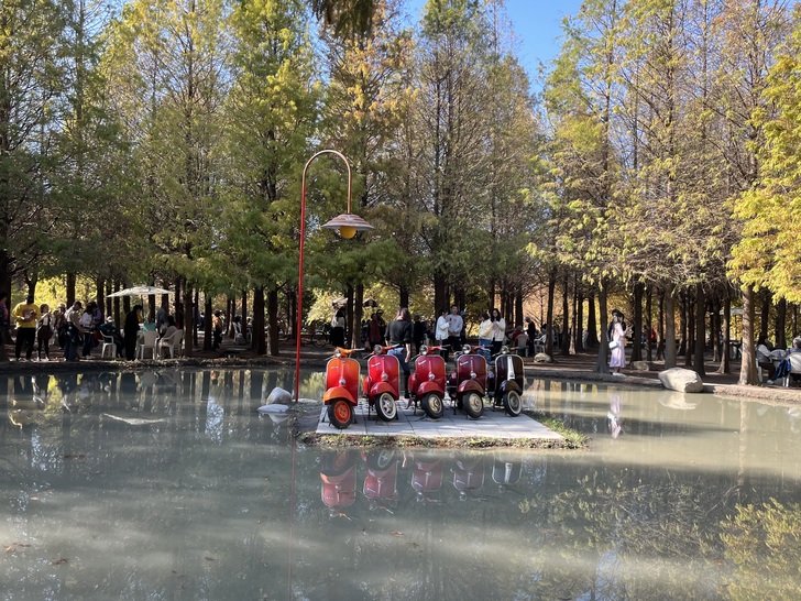 每年羽粼落羽松都會呈現不同的造景 今年最新的裝置藝術 偉士牌 有種懷舊純樸的氣息