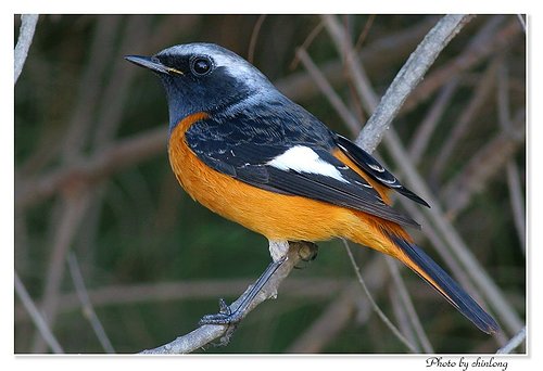 雄鳥:頭頂到後頸銀灰色,臉、背、翼及尾羽中央黑色,胸腹及尾羽為橘紅色,翅膀上有一塊白斑,休息或飛行時都非常明顯。