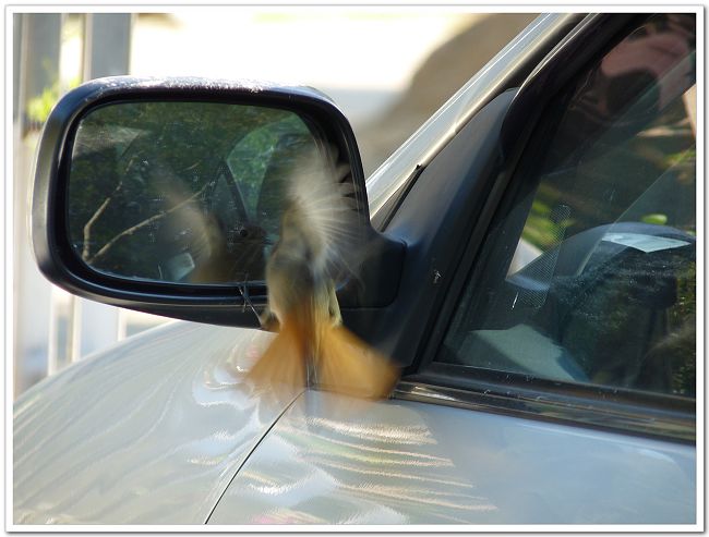 我們發現這隻黃尾鴝不太怕人,不知道為什麼好愛照鏡子?尤其是喜歡站在黑色車子的後視鏡上,有時還對著鏡子奮力撲過去...是因為牠迷途,牠的伴沒跟來而在找伴嗎?還是牠愛美而顧影自憐呢?....無解.