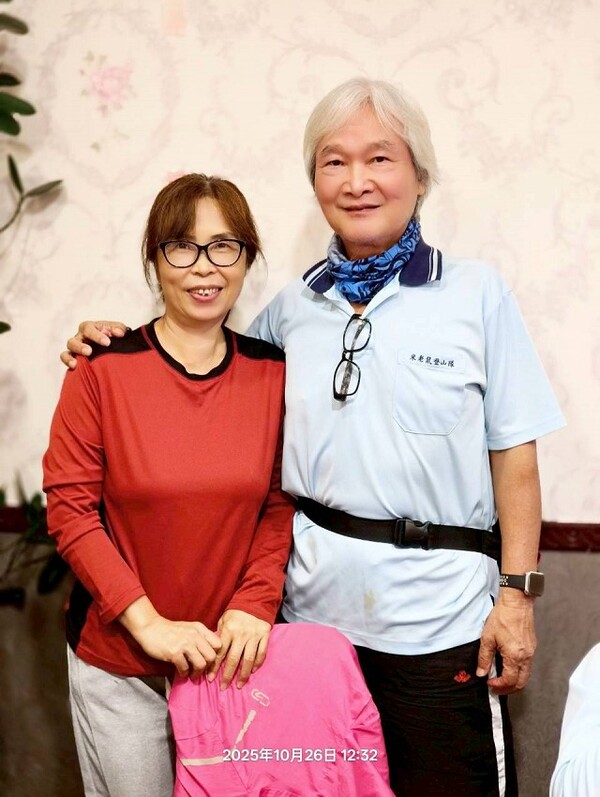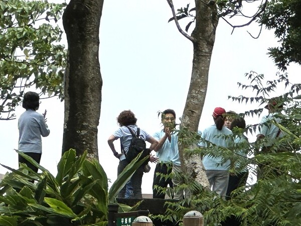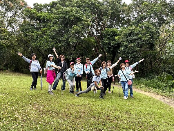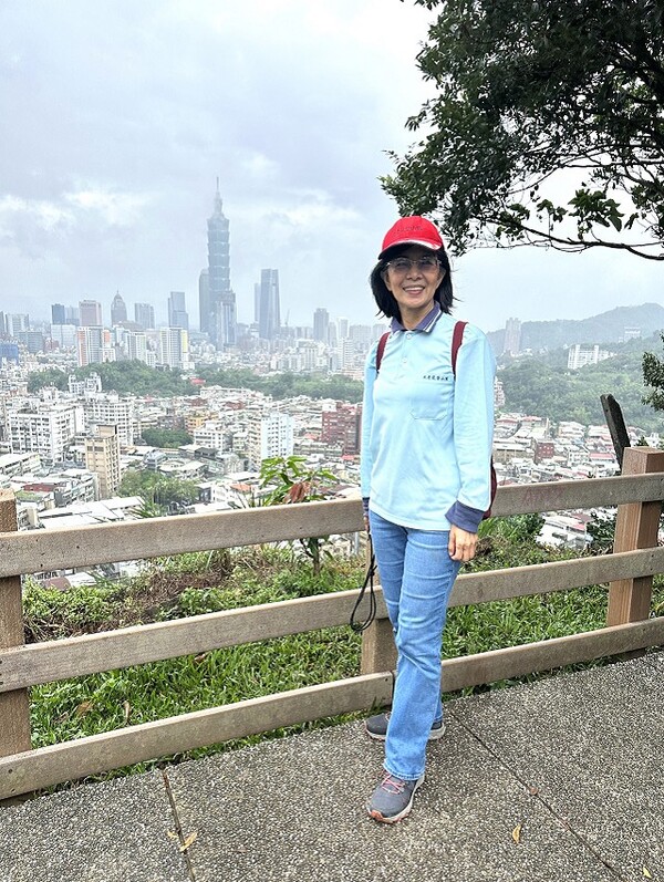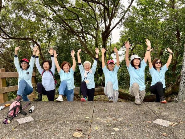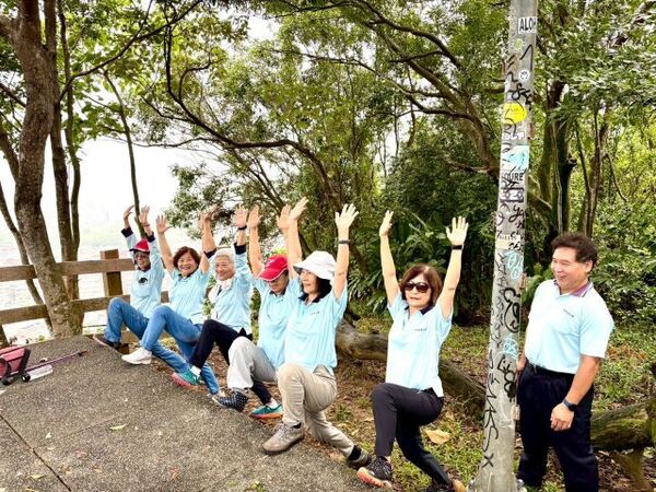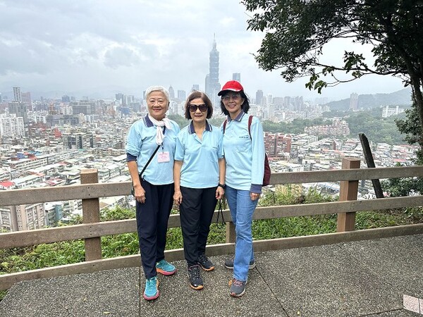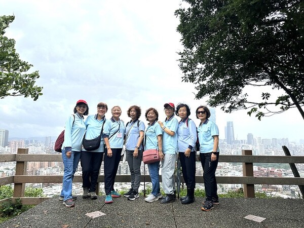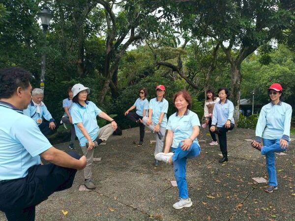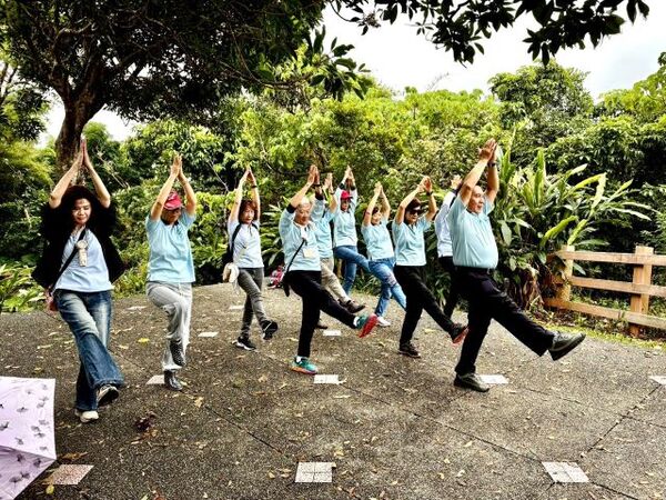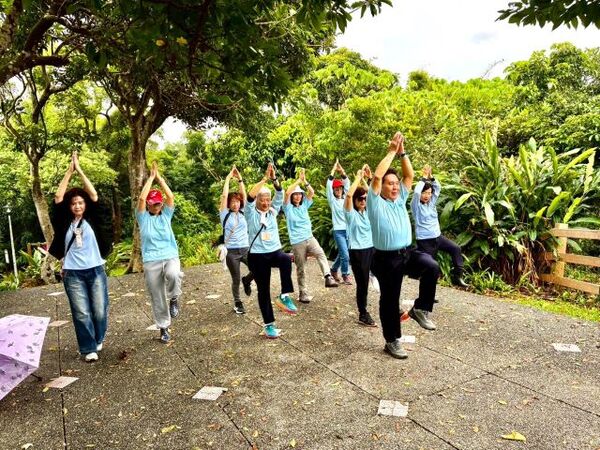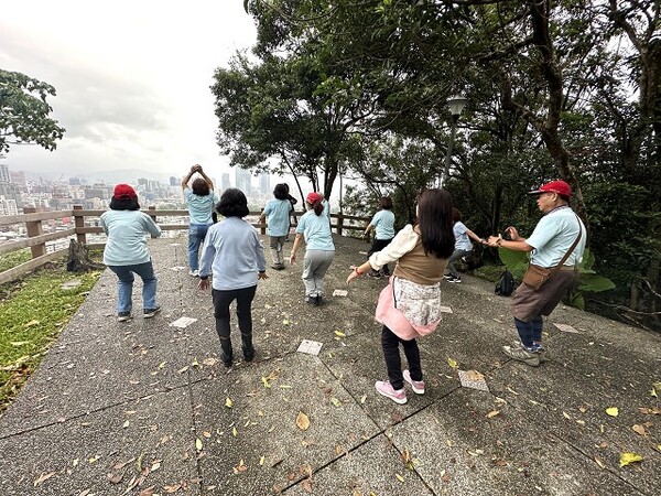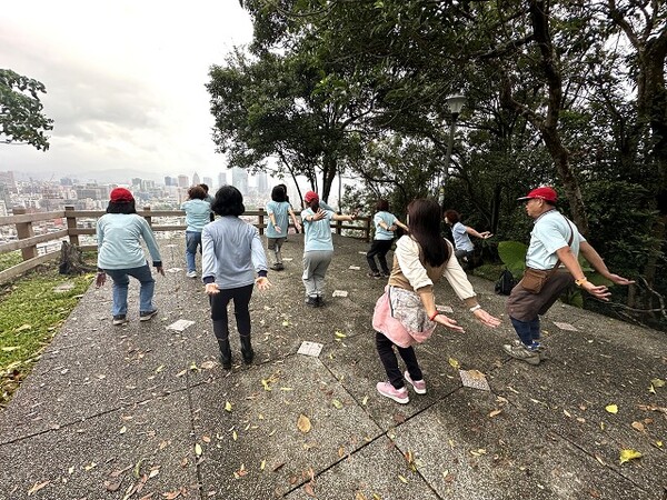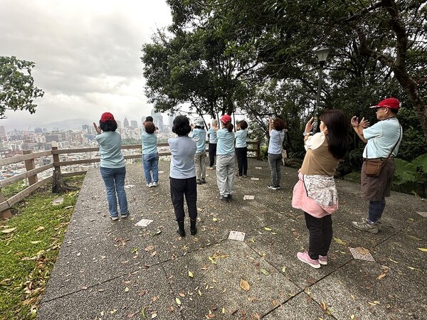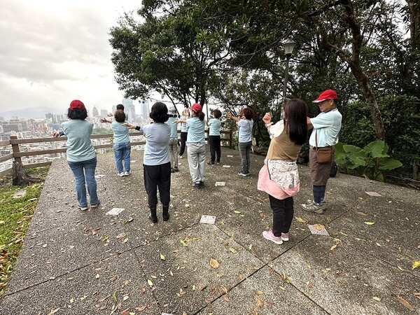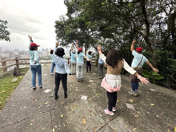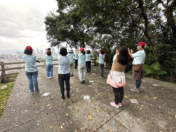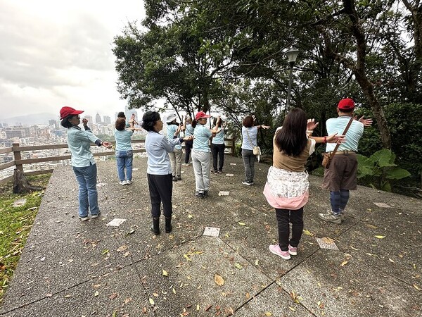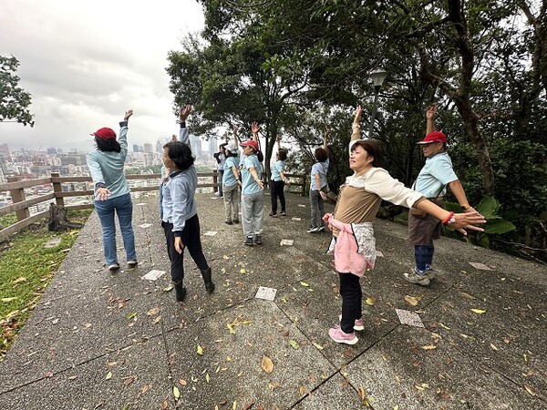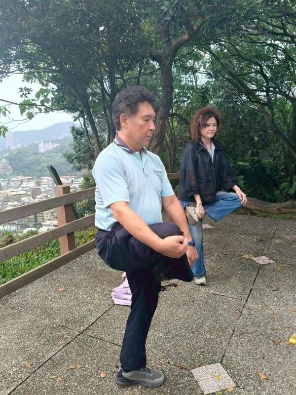 此時李老師在觀景台帶動成員活動筋骨