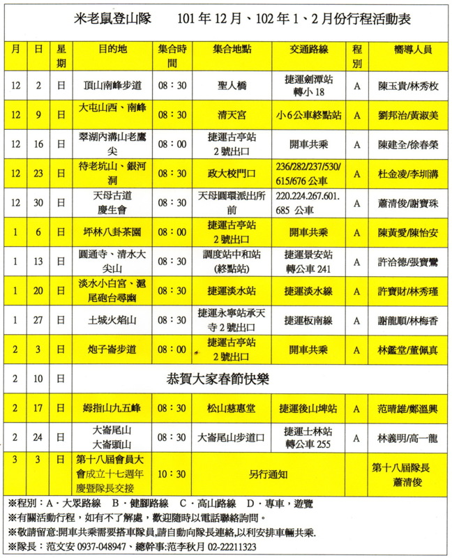 米老鼠登山隊101年12月102年1、2月份行程活動表