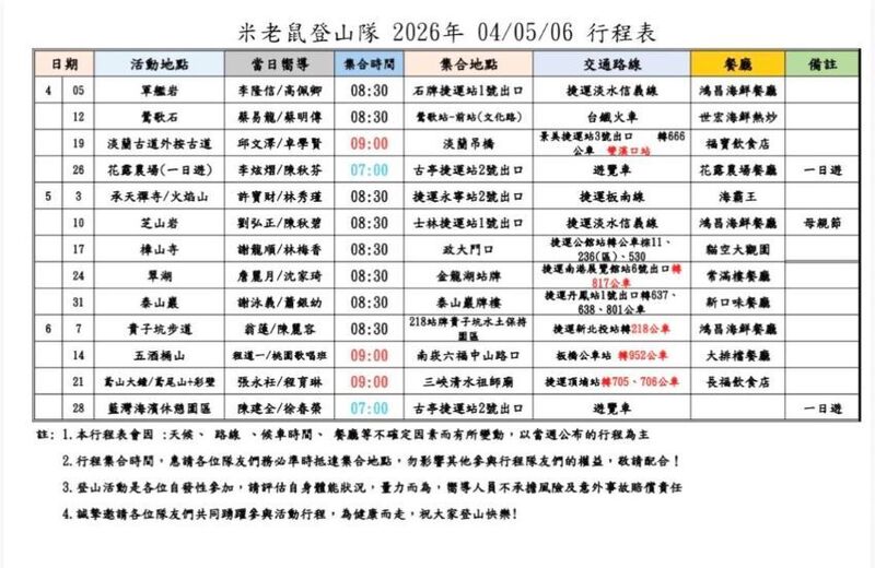 米老鼠登山隊2026年04/05/06行程表