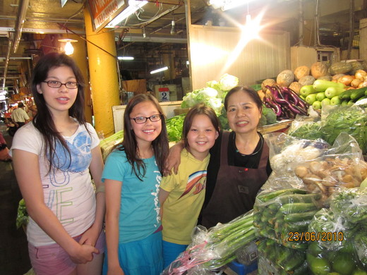陳女士很客氣的對我說:[需要什麼?]我們買了幾十元的蕃茄,她找錢後再度詢問:[還需要什麼?]我笑了起來說:[我們想和妳照相。]她馬上答應,顯然經常有人到菜攤去找她拍照,她很有經驗的指點我,該站在哪個角度,女兒和她則應該站在哪裡。然後,她指明要和[又白又胖]的老三站在一起,老三事後很高興的轉述給我家老爺聽,還特別強調又白又胖,主動翻譯成white and chubby。