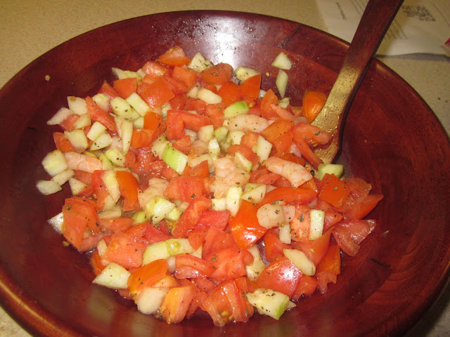 這道菜鮮蝦沙拉,是福至心靈的即興之作,把小黃瓜和蕃茄切丁,拌入鮮蝦雞尾酒多出來的蝦子切丁,用橄欖油和海鹽,乾的九層塔香料粉調味,簡單容易,而且大受歡迎。
