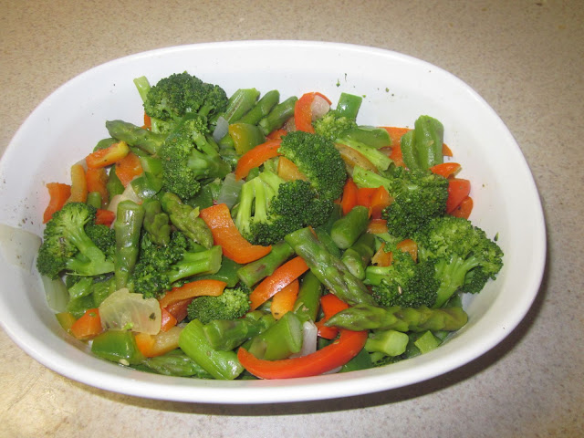 將洋葱,胡蘿蔔,青椒,蘆筍和花椰菜切塊或 切段後,用水煮熟,再用橄欖油,海鹽和oregano牛至草調味,如此大功告成,眾食客吃得大快朵頤,老媽子我看得大快人心。