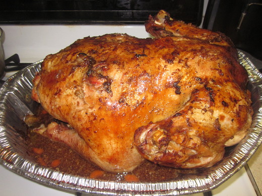 火雞一烤一個下午,四個多鐘頭,先用海鹽,胡椒,大蒜粉和五香粉抹上火雞全身,火雞肚子裡塞進糯米,佐以醬油,洋葱,胡蘿蔔丁和酸菜絲。我家年年用小隻火雞,今年這隻只有十一磅,結果烤了四個小時之後,還是沒有熟透,這還是大野狼媽媽烤火雞多年來,第一次沒有烤熟。可見古有明訓:熟能生巧一點沒錯,三年沒烤,火雞果然堅不煮熟,幸好,大致熟透,只有一點血絲。