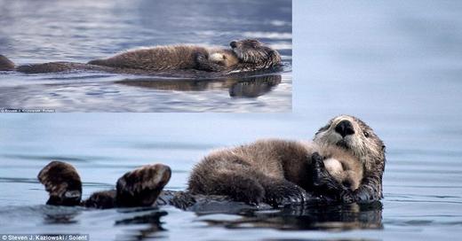 這溫馨的場面發生在美國阿拉斯加州南部海岸地區。在這陽光明媚的一天,水獺媽媽打算帶寶寶到河對岸去,但是困倦的寶寶可不願辛苦遊著過河。于是,水獺媽媽就採用仰泳的姿勢,把寶寶放在了肚皮上,發揮卓越的遊泳技能安全抵達河對岸。在這過程中,水獺寶寶全程酣睡,身上的毛都沒怎麼沾著水。