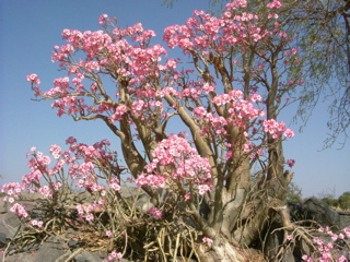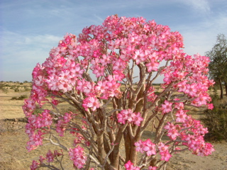 野地裡的沙漠玫瑰總開放在亂石堆中,開花的季節,一片葉子也沒有,只有整樹深深淺淺的桃紅色的花,我發現越是在亂石嶙峋的環境裡長出的沙漠玫瑰越是壯碩,推測是因為在漫天風沙的環境下,唯有卡在石縫中的種子才有機會成長、茁壯。醫療團團部也植了幾株沙漠玫瑰,卻因為我們整天澆水,長得瘦瘦小小,花也開得稀稀落落──這樣美麗的花,似乎無法承受太多的關愛?