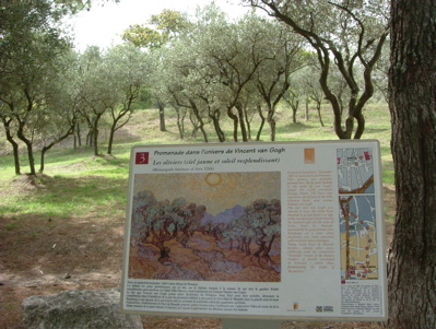 其實我是先看到“兩大塊”羅馬遺跡才臨時停車的,拍了一些照片之後,本來還在想,這個停車場真好賺,搞兩塊古蹟就可以每台車收2歐元,後來才發現,馬路的對面好像立了個牌子,過馬路看清楚,原來沿著小徑直走,就是梵谷曾經住過的聖保羅療養院(Saint Paul de Mausole)。
