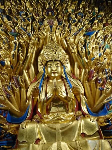 再說「大悲閣」,中供千手千眼觀世音菩薩。一般的千手觀音,其千手都呈放射狀安置在肩背;但此處卻將觀音安置壁之下方,千手則浮雕在背後牆上;且形狀扭轉伸展不一。乍看之下,直覺全壁皆在竄動。令人不禁震撼,讚嘆叫絕!於是當下吟成一首《千手觀音》詩云:
