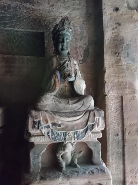 再說「北山石刻」,雕鑿时間比寶頂山更早;又因石質比較鬆軟,故風化比較嚴重。每一窟的內容不一,如今已給于編號,共編二百六十四龕窟。其中最受注意的是125號窟,是「數珠觀音」。觀音菩薩立姿,身體略為彎曲,顯出體態輕盈,綵帶風飄,由於風化緣故,只能看到其神情面貌略帶著腼腆的微笑,被稱為「媚態觀音」;更有稱為「東方維那斯」。