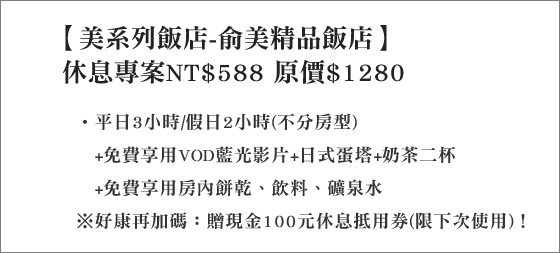 商品訊息簡述: 只要588元(雙人價)即可享【美系列飯店-俞美精品飯店】原價1280元休息專案:平日3小時/假日2小時(不分房型)+免費享用VOD藍光影片+日式蛋塔+奶茶二杯+免費享用房內餅乾、飲料、礦泉水,好康再加碼:贈現金100元休息抵用券(限下次使用)!