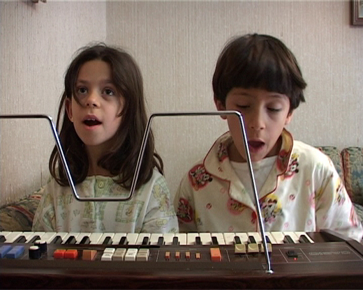 我最喜歡的作品是Ziad Antar的錄像「wa」,畫面中有兩個可愛小朋友(一男一女),看起來有點無聊的坐在電子琴前面,然後女孩按下按鍵,出現音樂節奏,接著她又按下另一個鍵,節拍也出來了,接著兩個小朋友頭開始點起來(好有節奏感哪!),然後就「哇~哇~哇」的唱起歌來,幾乎所有看這件作品的人都被這兩個小朋友的精采演出給逗笑了,很棒的感覺。