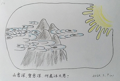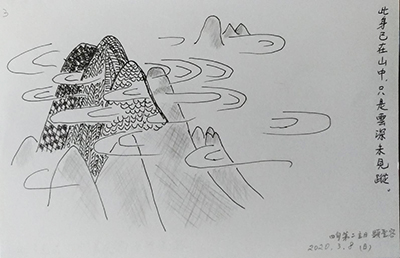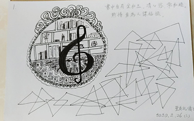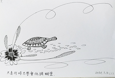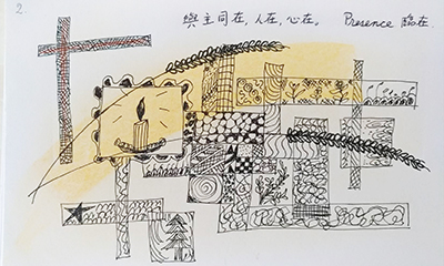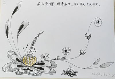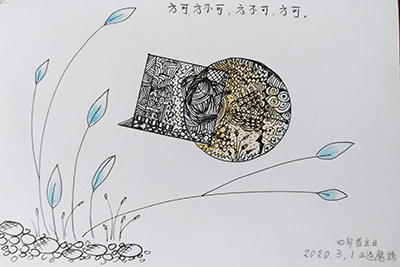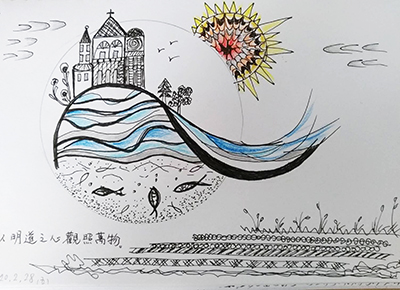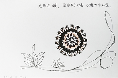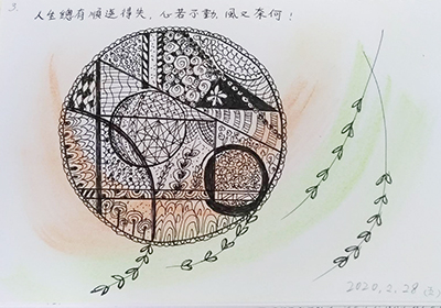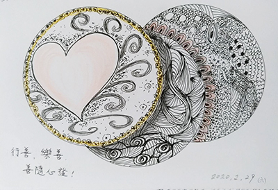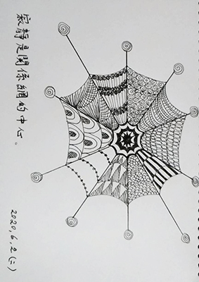 於是,我興起了將禪繞畫與我心靈體驗結合一起的願望。就在今年2020年2月開始,我向書籍、網路問津,自學自畫。早上由吸收天主聖言起到日間的生活體驗成了我畫作靈感的主要泉源;晚上,我在有意與無心之間隨著心的靈動、筆尖的走勢,自然完成,既是修行又是樂趣。