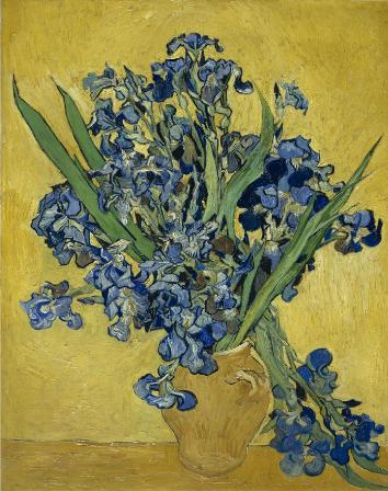 梵谷人生最後一年,畫了近 130 幅畫,1889--1890 年住在南法 Saint-Rémy 療養院後開始自大自然中尋找靈感、寫生園中花朵,最先畫的就是鳶尾花。鳶尾花的枝葉充滿生命的張力,靛紫的花朵跳躍枝頭、娉婷婀娜;細看嬌嫩的花瓣筆觸充滿感情與力道,蓊藍的美麗花朵其實是梵谷渴望友情與愛情的孤獨靈魂。