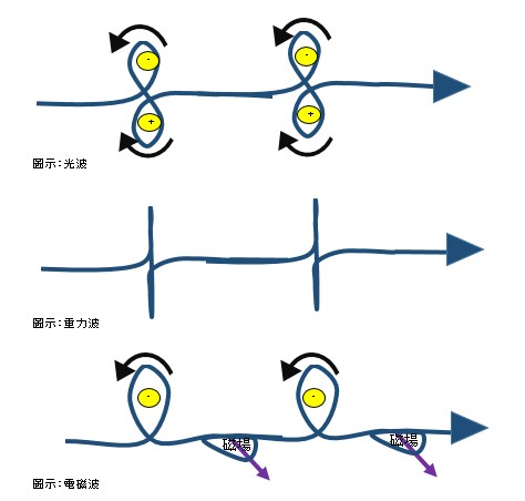 - 重力波:有重力場、無磁場、無電場,重力波指時空曲率中以波的形式從射源向外傳播的擾動,這種波會以重力輻射的形式傳遞能量。愛因斯坦根據廣義相對論於1916年預言了重力波,LIGO發現時空漣漪