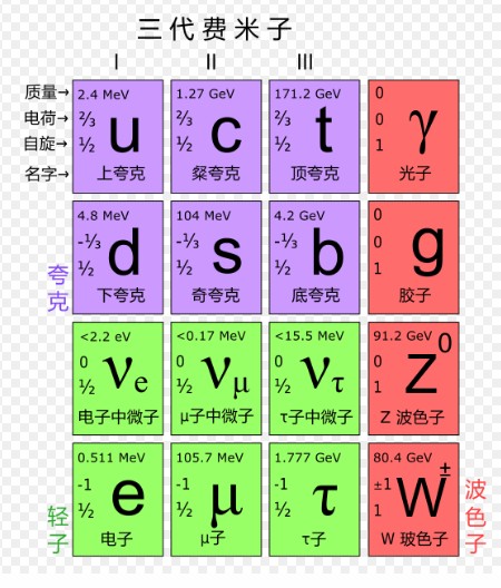 目前的实验显示共存在6种夸克(quark),和他们各自的反粒子。这6种夸克又可分为3“代”。他们是
