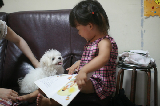 我常常拿芊芊的玩具給薺薺玩,也在芊芊剛買的三顆球中,要芊芊自己拿一顆給薺薺玩,應該是阿嬷教的好,芊芊從來不會說不要,還很樂意的三顆都要給薺薺。看薺薺追球球追得很高興,芊芊甚至拿出她平常睡覺要抱的熊熊布偶到薺薺跟前。芊芊薺薺一起長大,無意中還讓芊芊學習到分享的精神,這是芊芊的另類學習,也是我這個當媽的欣慰,對於家中的寶貝,我可是兩個都愛喔。