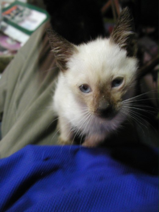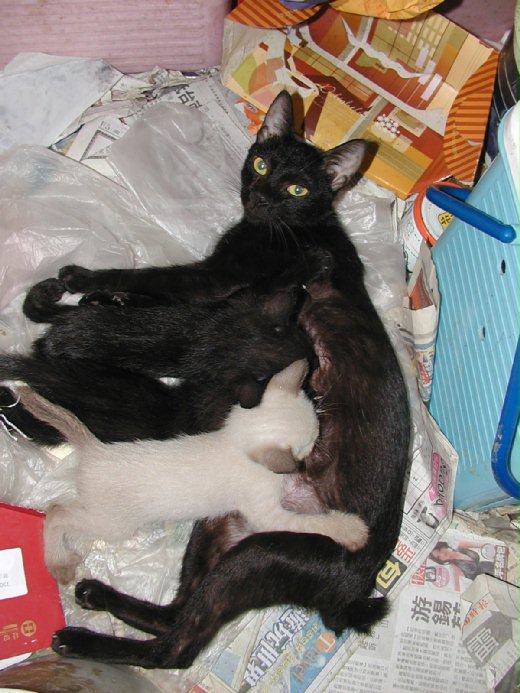 不久前一個黑媽媽突然出現,不知道她已將生產,就在我的打字桌下,生了四個小孩,兩白兩黑,最早出生的孩子因當天我回住處時已生下一段時間,忙著要發稿又沒注意,發現時身體已冰冷,趕緊幫忙清掉胎盤,找來一個紙箱,把黑媽媽與小貓放進去,不久,她又陸續生下三個,可能是第一次生產,不知道怎麼清理小貓,只好幫忙一一把連同小貓一起排出的血塊與胎盤殘餘,隔天,最早來到人世的老大,不幸只待了不到一天就離開,雖然其餘三個有兩個健康狀況還不是很好,但相信有這個愛小孩的母親,應該可以順利長大,只是,他們在我這裏,很難得到妥善的照顧,真希望有愛貓的人,能夠收留,照顧他們。