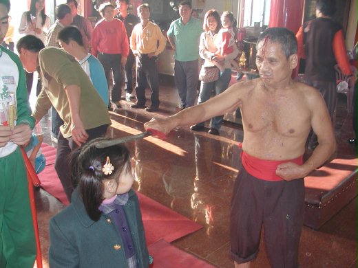 廟方人員搭設簡易的七星橋,也有各生肖的小紙人,不同一般道教廟宇的地方是,信徒過橋三次,由廟方持法器祭血過的乩童持劍拍打身軀,除去晦氣,第一次看到乩童持劍拍打消災,而不是道士持牛角長鞭,覺得奇怪。