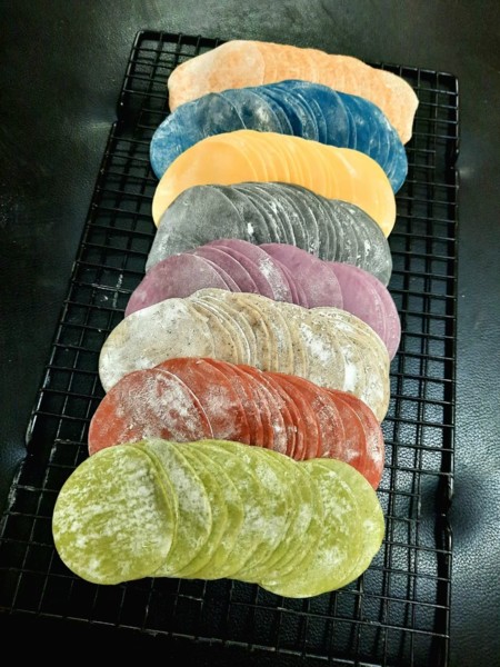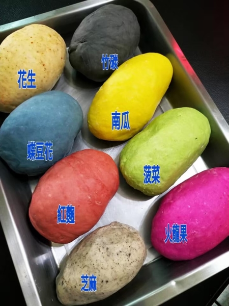 顏色來源:南瓜.紫薯.蔬菜.火龍果.芝麻.蝶豆花.花生.紅麴.竹碳.海苔.紅藜麥……