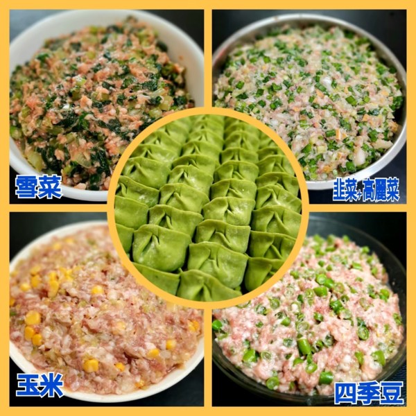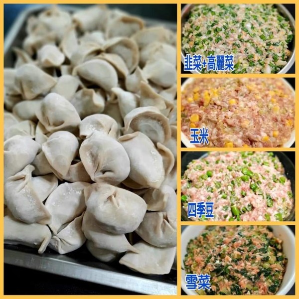 內餡:1:豬肉+韭菜 2:豬肉+高麗菜 3:豬肉+韭菜+高麗菜 4:素食