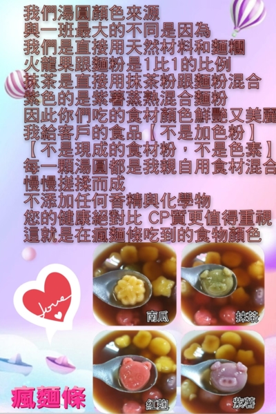 ✪顏色來源:地瓜.紫薯.抹茶.火龍果.蝶豆花.甜菜根.可可.紅麴.竹碳.花生.芝麻……絕對沒添加色素,純天然的食材,可以放心食用。