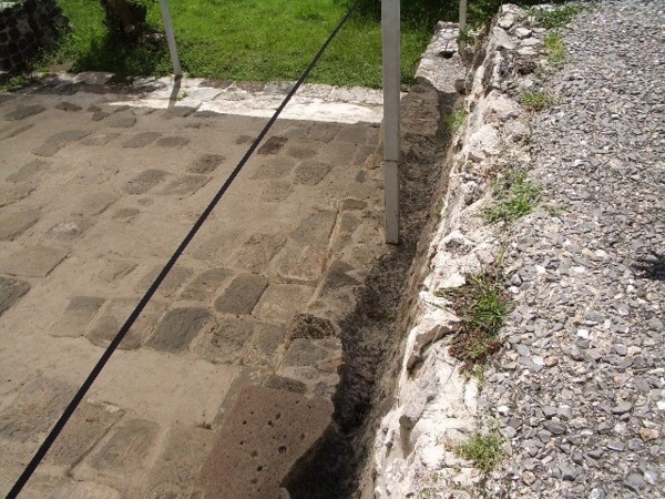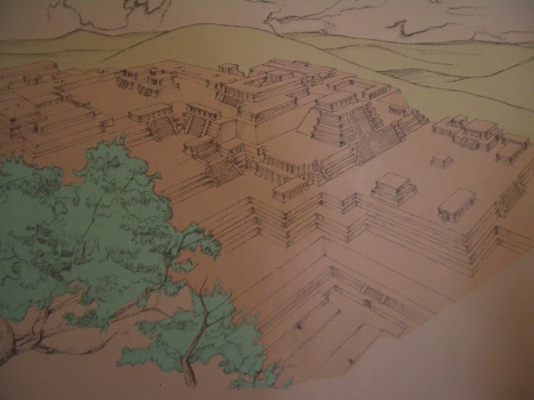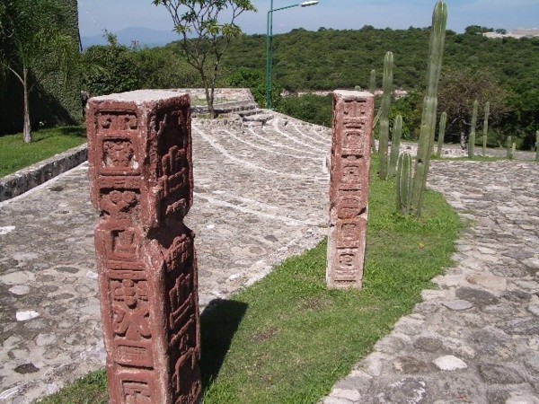 Xochicalco是一個經過規劃的古城[圖4, 5],它由三個經過人工修整的階地所組成[圖6],各階之間由陡梯連接。入口在南,以綠地廣場形成南北走向的中央軸線。在中央軸線兩側配置了多個高台及金字塔[圖7]。中美洲的「金字塔」與埃及金字塔不同。埃及金字塔是由巨石疊成的君王墳墓,中美洲金字塔則是卵石砌成的祭壇,形制也不相同。高台上有許多石碑[圖8],以圖像記述著重大的歷史事件。從高台和祭壇的形制以及石碑上的圖騰,可以看出當時不同文明之間有相當密切的交流。