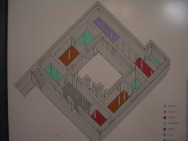 第一階由護城牆、高台及住宅[圖9]組成,第二階有市場、高台、石碑、住宅、蓄水池,第三階是統治者的區域,有行政機關及祭壇。第二階東側有一住宅區,其旁有一約20公尺長的石板坡道[圖10]。每一塊石板上刻著不同的動物形狀[圖11],但是猜不出它的用途為何。