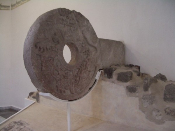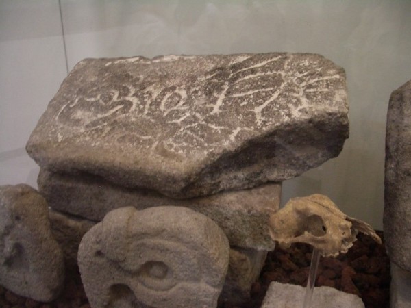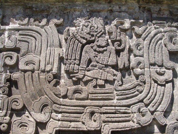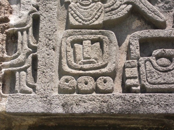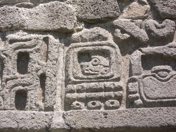 除了羽蛇之外,四壁浮雕來記述著來朝的君王[圖15]以及他們的姓名。石碑及陶器上也雕刻了許多有關國王及貴族的事蹟(沒有平民),有一個國王就叫十八兔。Xochicalco人有很有趣的符號系統。中國人是結繩記事,他們可是刻石為記,如圖16,一個圓圈代表1,一條橫帶代表5,上面方框內畫一個猴頭,這代表著旁邊的君王(在右側,沒拍到)的名字就叫「十三猴」(養了十三隻猴子的君王)。這些各方來朝的君王使節再次印證了當時不同地區文明的交流及融合。