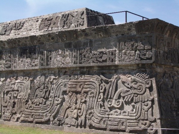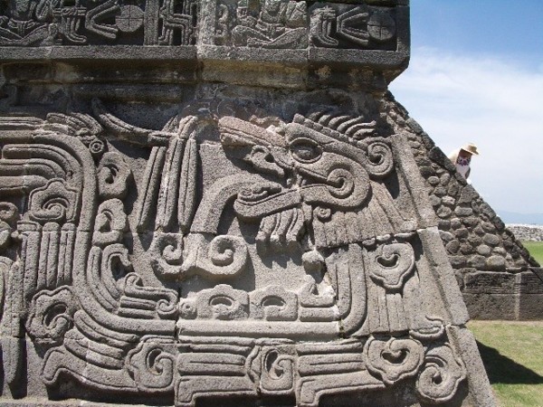主祭壇四壁的圖案以「羽蛇」串連之[圖14]。西班牙後裔的墨西哥人所稱的「羽蛇」東方人看著卻像龍。據考證,中美洲印地安人的祖先也是蒙古人種,在冰河時期,由亞洲跨過白令海峽,來到美洲。那麼,「羽蛇」或許真的和「龍」是有血緣關係呢!