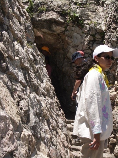 在第三階東側有一個人稱「羽蛇金字塔」的祭壇。祭壇四壁有十分華麗的浮雕[圖12],記述著西元765年大修曆法時,四方來朝的盛事。馬雅地區有二種同時存在、相輔相成的曆法:一年365天的太陽曆及260天的神曆。Xochicalco的曆法,很像中國的天干地支。不過,他們是13天干,20地支(1年20個月),每隔幾年也須要閏日來加以調整(http://www.ancientscripts.com/ma_ws.html)。他們除了利用高台及石碑之相對位置進行天文觀測外,也在西北側的地下鑿洞,其入口極狹,僅可容一人出入[圖13],進去之後,通道較寬,長約100公尺,內有一暗室,僅有一深約8米的小孔可觀天,每年夏季有幾天太陽會直射入洞,藉此校正曆法。根據現代天文學者的推算,在西元765年的時候,Xochiclaco邀請了各地的君王使節來此共商大計,一口氣調了六個閏日,以使曆法與實際觀測相符。類似這種修曆大事,在中國、歐洲歷史上都曾發生過。誰敢說上古中美洲印地安人沒有科學精神呢?