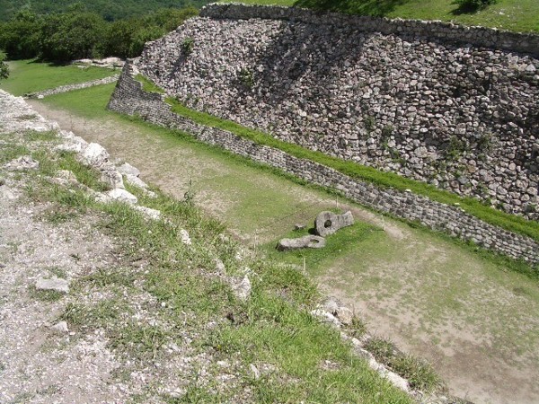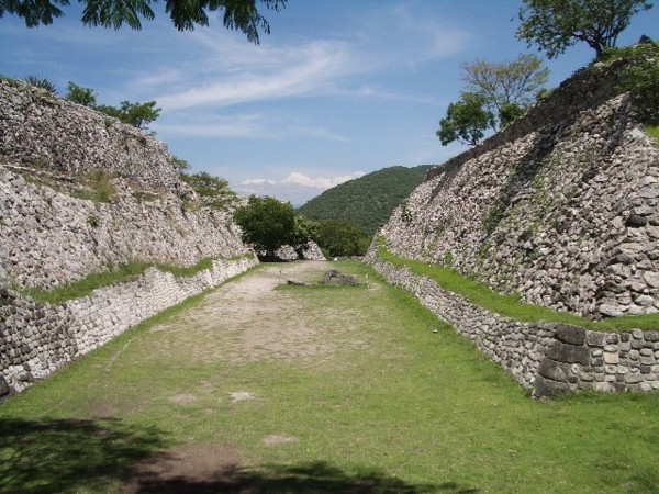 Xochicalco有三個呈I字型的球場。球場的兩端是休息區[圖18],中央球道的兩側是高坡[圖19,20],在兩側邊坡的中央各懸掛著一個石圈,做為球框[圖21]。各隊球員身著護具,先以肘、腰、膝(不能用手、腳)將木球頂入自己的球框者為勝[圖22]。不過,最後勝利的一方卻會面臨死亡,因為他們認為只有勝利者才有資格被揀選獻神。這真是一個奇特的風俗!(如果不拼命找死,故意不進球框,恐怕也不免累死)。Xochicalco人也是持二元論的宇宙觀,凡事均有正反、陰陽二面,所以生死是生命的二種不同形式而已,他們認為生命的重點在於保持均衡中道。這和中國思想十分接近!